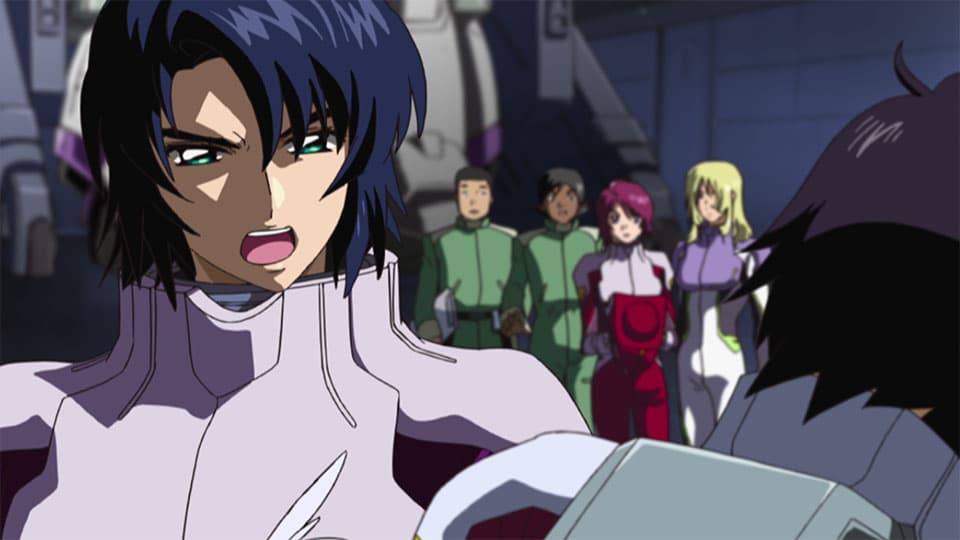 Shinn is drawn away from the battlefield and discovers the construction site of an Earth Alliance frontline base. He is outraged to realize that the Earth Alliance forces are using the local civilians for forced labor and begins wiping out the enemy soldiers in a destructive rampage.
