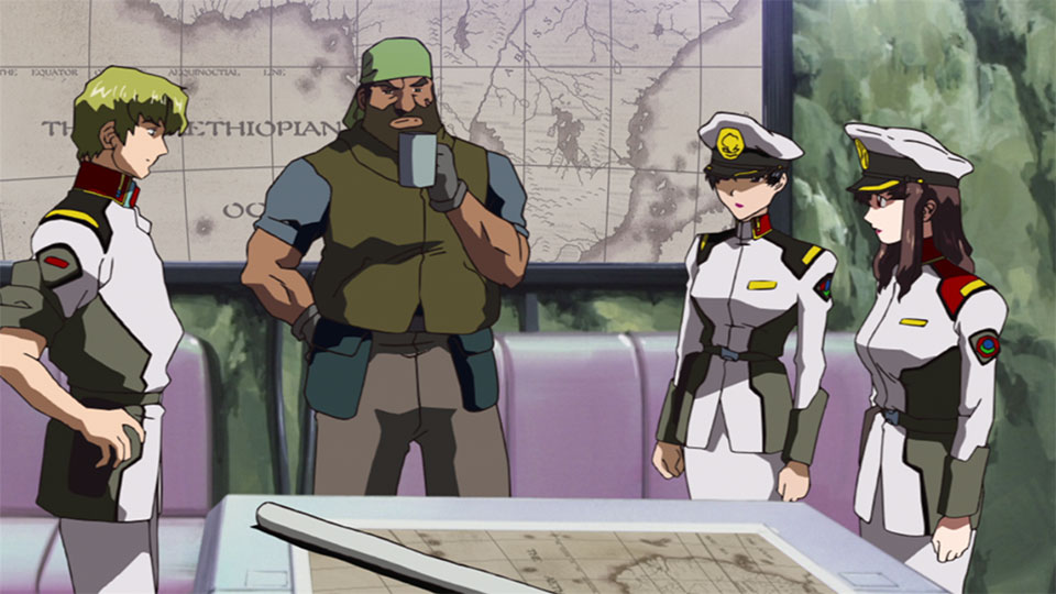 Murrue and the crew are led to the resistance’s hideout by the leader Sahib and hear the fall of the Alliance’s Africa base, Victoria spaceport. The fall means the only route to Alaska for the Archangel is to go through the Red Sea and then to the Pacific Ocean. And “Desert Tiger” Waldfeld and the land battleship Lesseps await in its route.