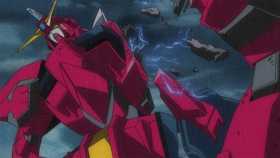 Kira cries out and slices off the Aegis Gundam’s right arm. But Athrun captures Strike Gundam and then sets the Aegis to self-destruct. Strike Gundam and Aegis Gundam explode with a deafening roar, Kira remaining inside the cockpit…